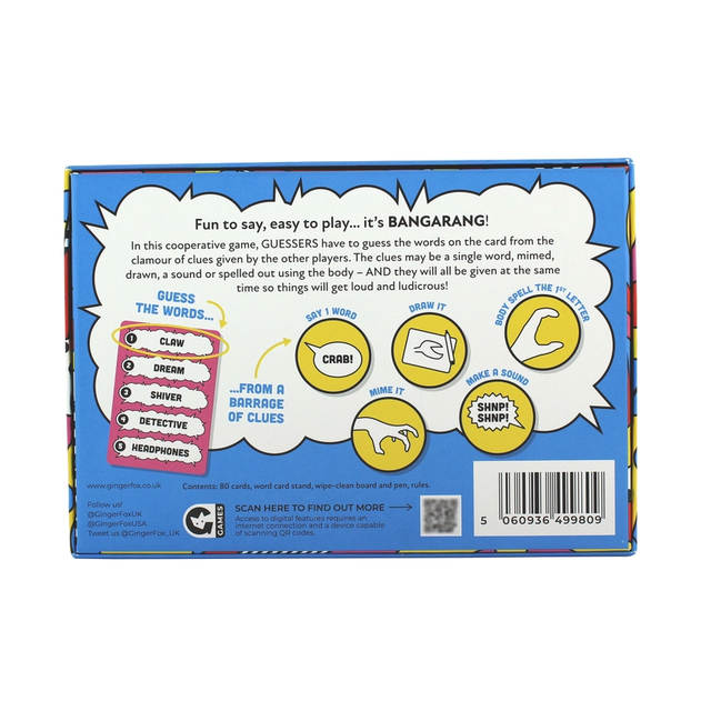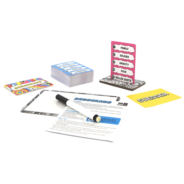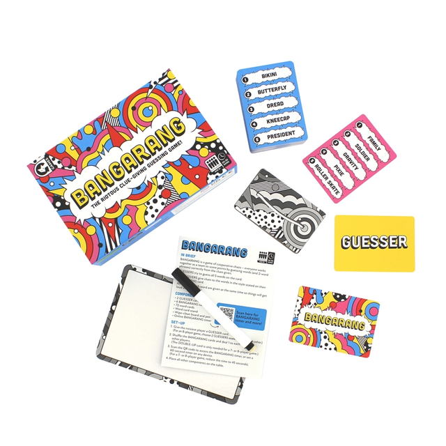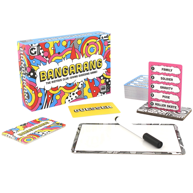 BANGARANG is a game of cooperative chaos - everyone works together as a team to score as many points as possible by guessing words based on the clues given.