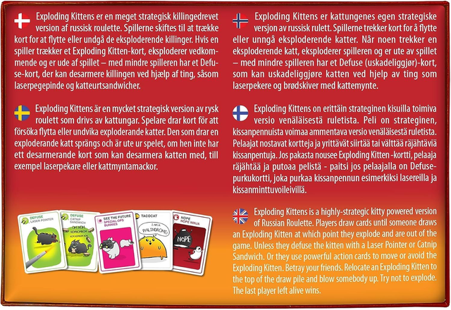Looking for an adrenaline-packed game night? Look no further than Exploding Kittens! This highly-strategic, kitty-powered version of Russian Roulette requires you to draw cards until someone draws an Exploding Kitten, at which point they explode and are out of the game. With options to defuse the kitten with a laser pointer or catnip sandwich, or use powerful action cards to move or avoid the Exploding Kitten, this game requires both betrayal and survival skills. Aiming to keep your friends close while trying not to explode, the last player left alive wins! Get ready for a fun-filled and hilarious game night with Exploding Kittens.